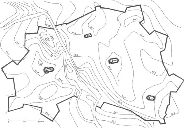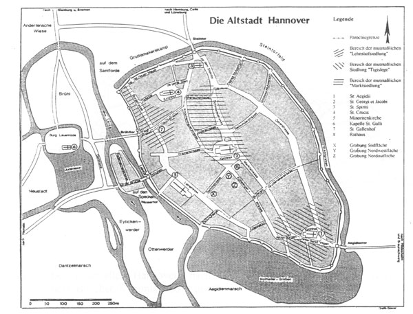 2) Rekonstruktion der Altstadt um 1350 (aus Bohlendamm Vorbericht I, Abb. 2) |