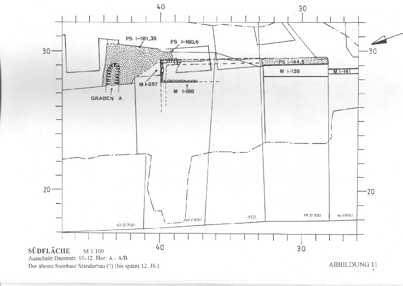 Abb. 11: Südfläche, Ausschnitt Dammstr. 10-12.Hor. A - A/B. Der älteste Steinbau/Ständerbau (?) (bis spätes 12. Jh.)