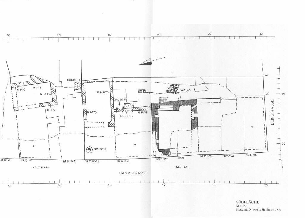 Abb. 18: Südfläche. Horizont D (zweite Hälfte 14. Jhd.) Für eine vergrößerte Ansicht auf die Abbildung klicken.